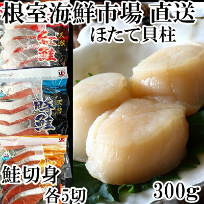 【ふるさと納税】根室海鮮市場<直送>紅鮭・時鮭・秋鮭切身各5切、天然ほたて貝柱300g A-28085