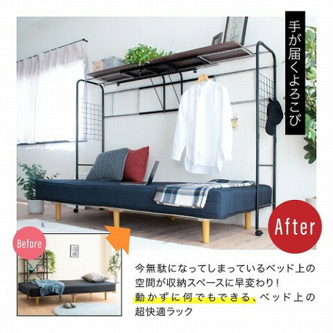 ベッド用 ラック ベッド上 棚 収納 キャスター付き 伸縮式 上棚 奥行き40 高さ148 ブラック ダークブラウン ハンガーラック 収納付き 衣類 スチール