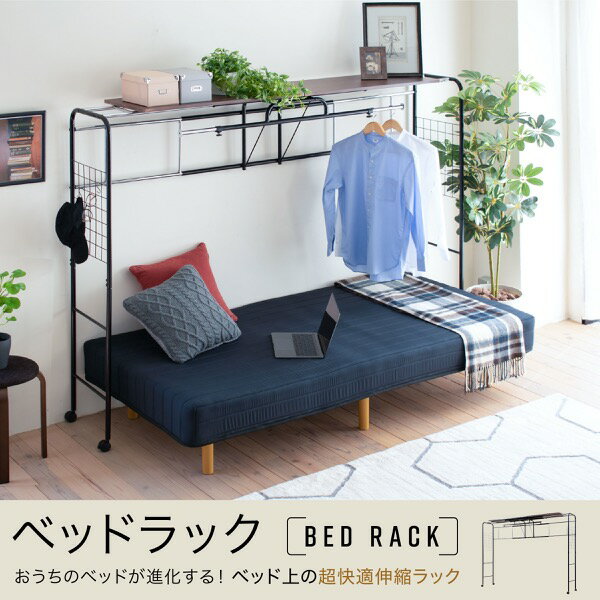 【代引不可・送料無料】 ベッド用 ラック ベッド上 棚 収納 キャスター付き 伸縮式 上棚 奥行き40 高さ148 ブラック ダークブラウン ハンガーラック 収納付き 衣類 スチール